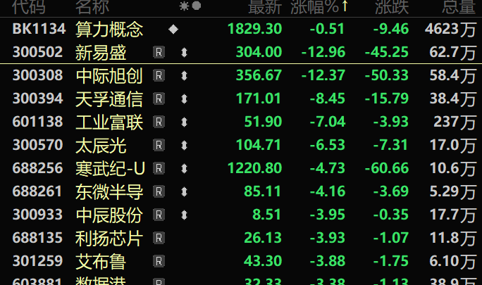 9月8日早盘,AI算力板块个股普遍回调,概念指数下跌1.25%,截至午间收盘,被市场称为“易中天”的CPO三只股票中,新易盛、中际旭创跌超12%,天孚通信分别下跌8.45%,此外,工业富联跌幅也超7%,太辰光、寒武纪-U等个股均大跌,板块超110亿元主力资金净流出。