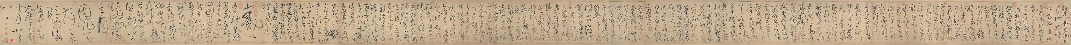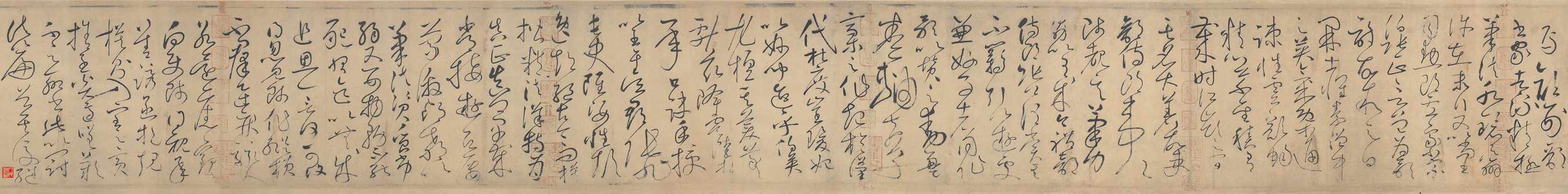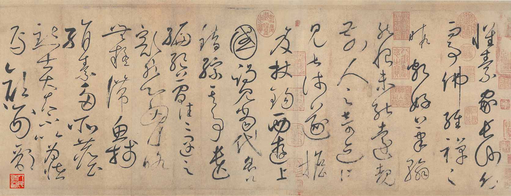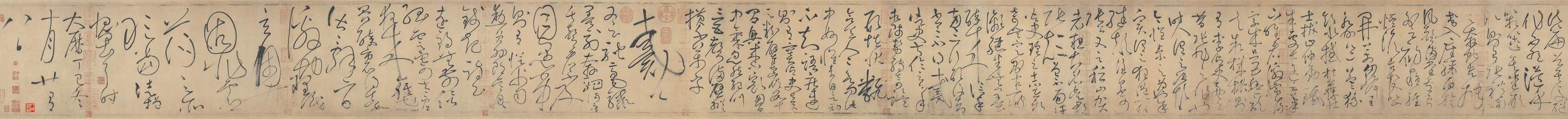 草书是汉字最为简约的字体,其特点是结构简省,笔画连绵,纵任奔逸,赴速急就。怀素的草书成就极高,与唐代的张旭并称为“颠张狂素”。《自叙帖》现收藏于台北故宫博物院,是怀素中年以后的草书巨制,文章列举了当时诗人、名流对他书艺的赞美,并以浪漫恣肆的笔墨线条传达豪放自得的心情。通篇神采飞扬,如龙蛇竞走,飞动圆转,随手万变。在字形结体及章法布局上,尤其富有创造性,有时几个字一笔连绵写成,有时又将某个字夸张放大,处理手法娴熟多变,奥妙绝伦,给人以新奇而又富于抒情性的艺术感受。