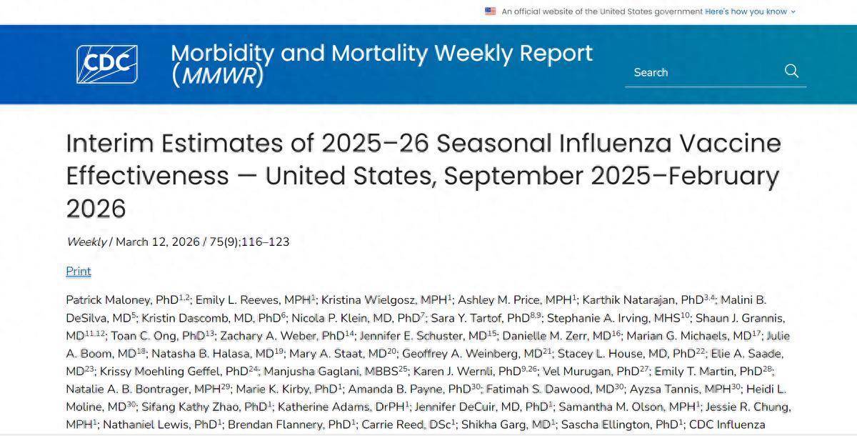 (人民日报健康客户端记者 侯佳欣)美国2025~2026年流感季逐渐进入收尾阶段。当地时间3月13日,美国疾病控制与预防中心发布的数据显示,本季流感疫苗的保护效力远低于预期,是近20年来表现最差的季节之一。具体来看,本季流感疫苗对成人预防因流感前往诊所、急诊或住院的有效率为25%~30%,儿童接种疫苗的有效率约40%。通常情况下,疫苗有效率要达到40%~60%,但本季的有效性远低于这一区间。